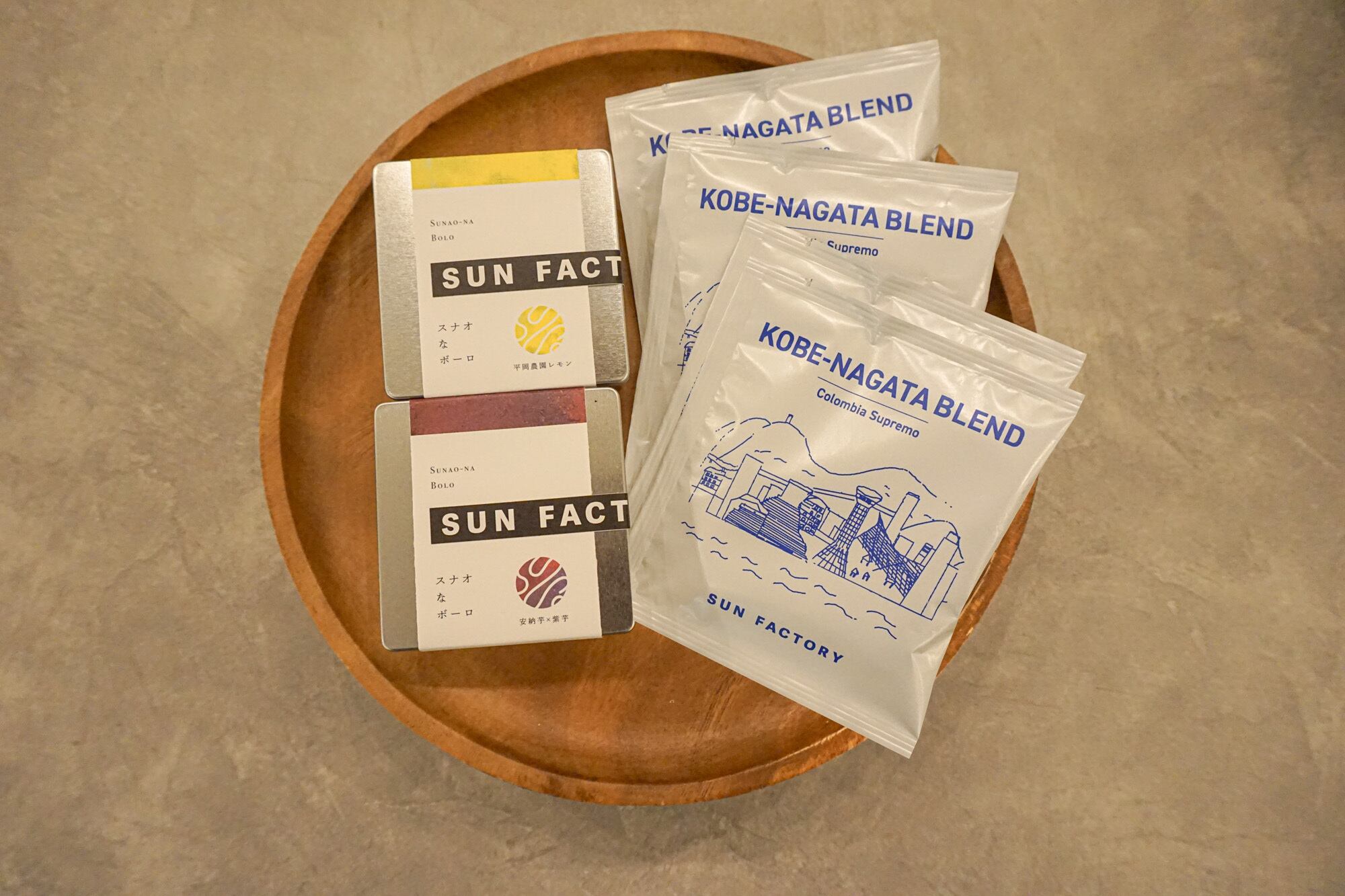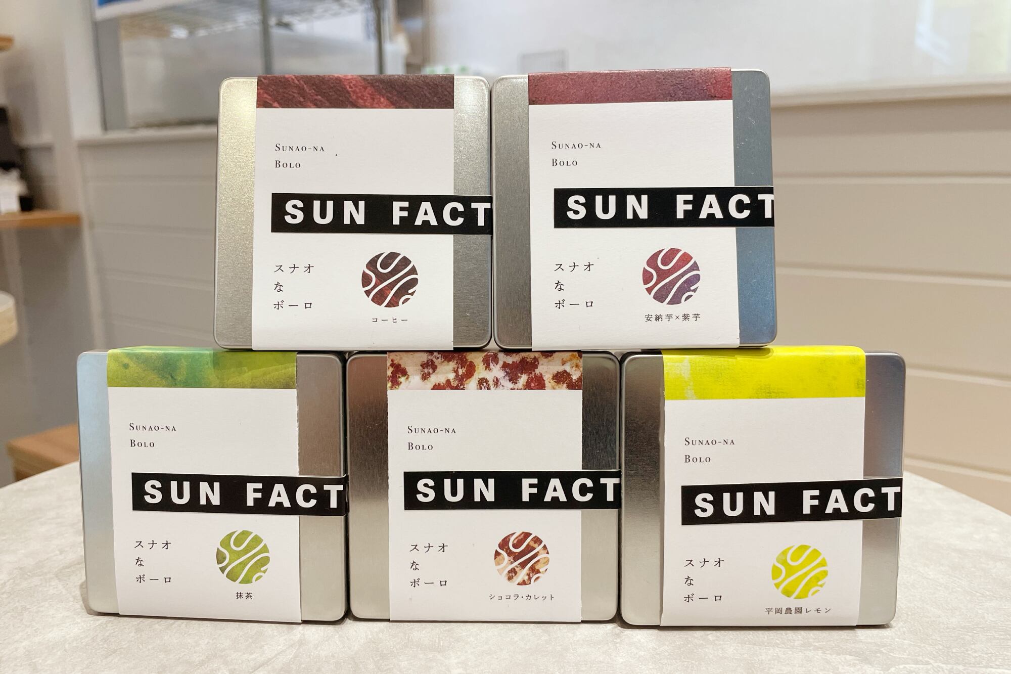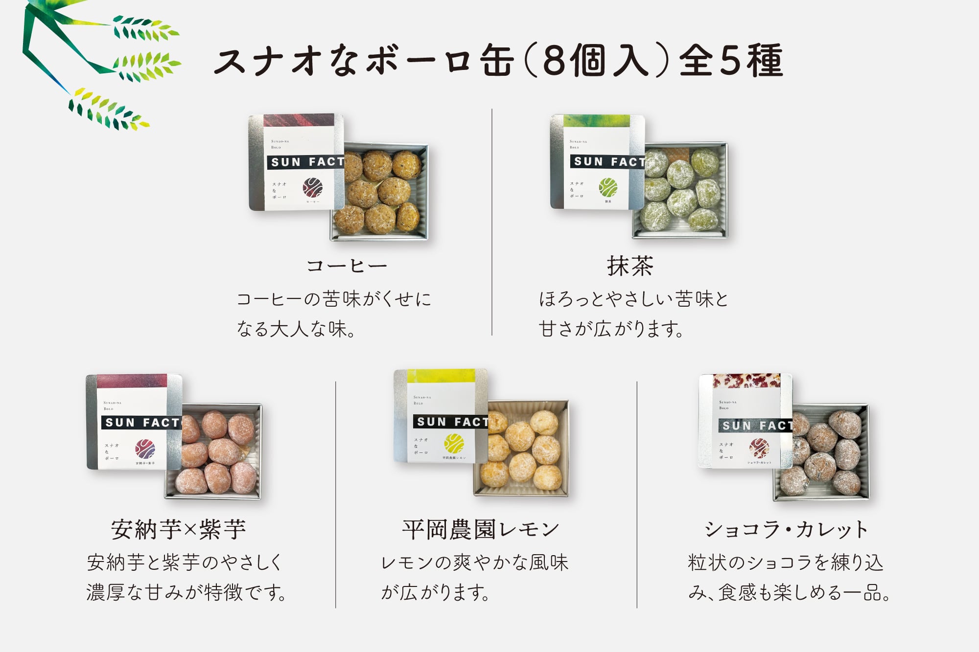 スナオなボーロ缶は、コーヒー、抹茶、安納芋×紫芋、平岡農園レモン、ショコラ・カレットの5種があります。