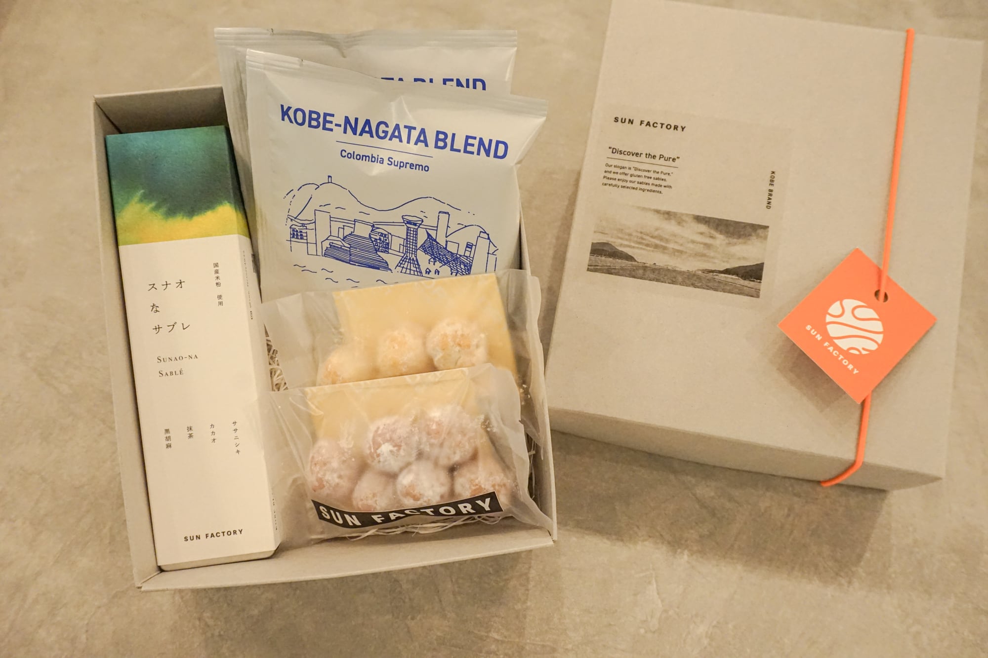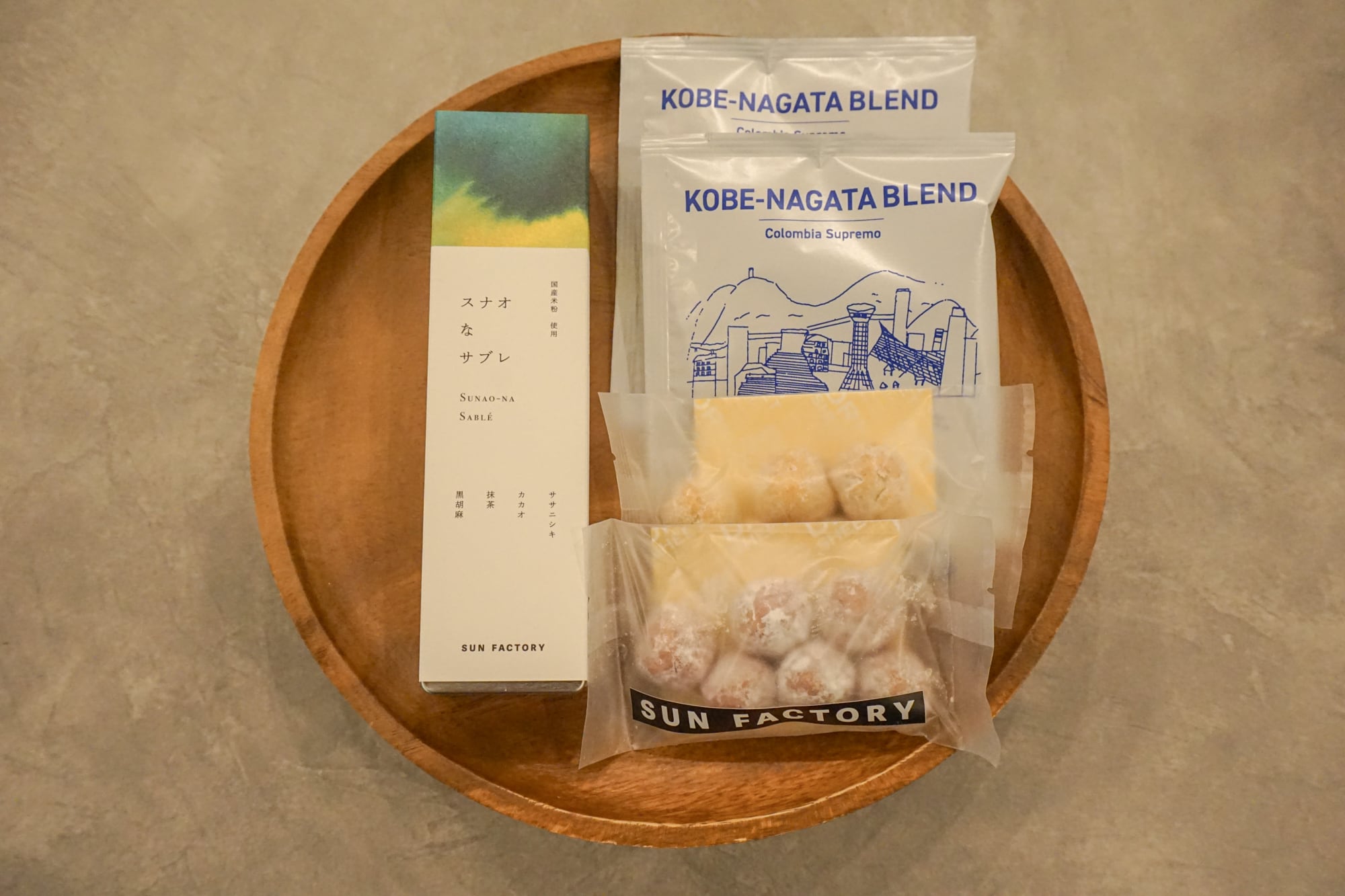 兵庫県産米粉使用のグルテンフリーサブレ缶、ボーロとドリップバッグコーヒーのセットです。