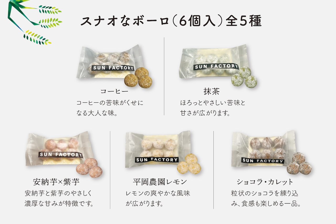 スナオなボーロは、コーヒー、抹茶、安納芋×紫芋、平岡農園レモン、ショコラ・カレットの5種があります。