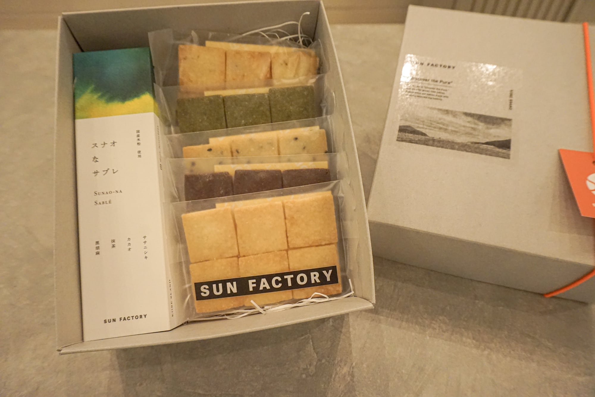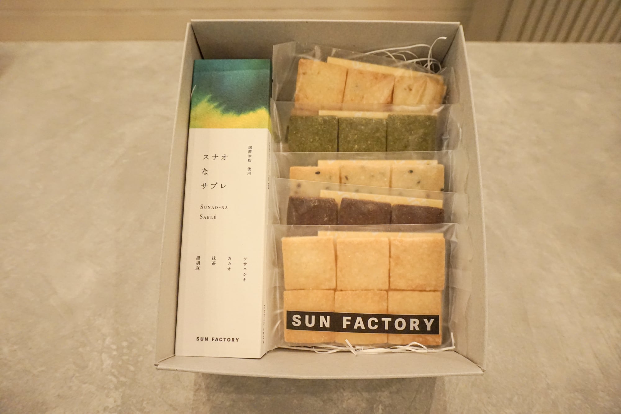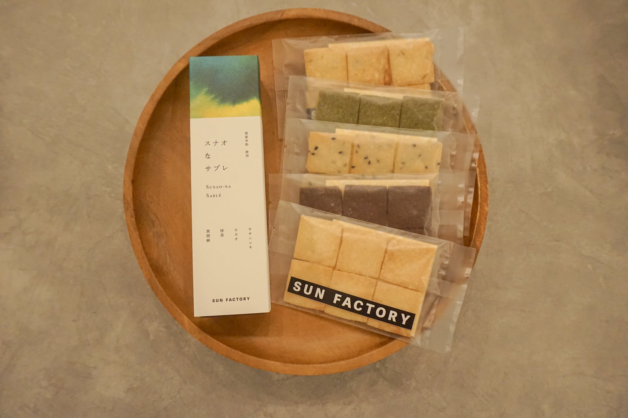 スナオなサブレは、ササニシキ、アサヒ、抹茶、ジンジャー、黒胡麻、カカオ、神戸スパイスカレー、チーズ・ブラックペッパー、バジルトマトの9種があります。